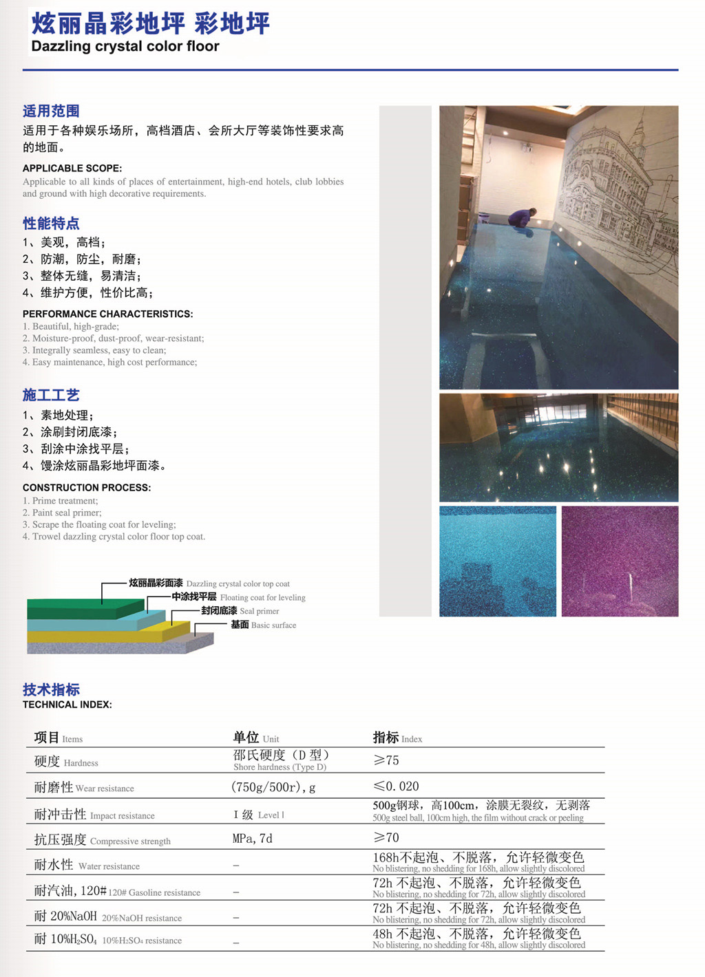 适用于各种娱乐场所,高档酒店、会所大厅等装饰性高的地面;A、美观,档次高;B、防尘、防潮、耐磨;C、整体无缝,易清洁D、维护方便,性价比高;